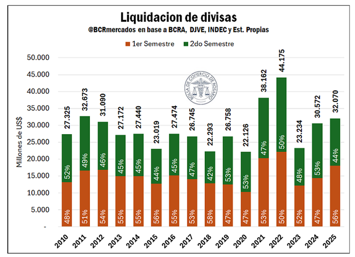 A pesar de la caída de los precios internacionales, la liquidación de divisas del sector agroindustrial alcanzó los US$ 18.101 millones, posicionándose como el tercer valor más alto en la historia para un primer semestre. Este monto representa el 56% del total proyectado para 2025, que asciende a US$ 32.070 millones, superando ligeramente el aporte de 2024 gracias al mayor volumen exportado.