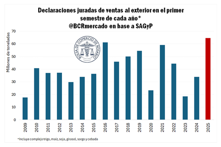 Este volumen representa el más alto para un primer semestre y el segundo de mayores operaciones desde la implementación de los Registros de Operaciones de Exportación (ROE verde) en 2008. El récord se atribuye a una mejor producción de lo esperado tras la sequía del verano y una rebaja temporal de las retenciones a los principales granos y subproductos.