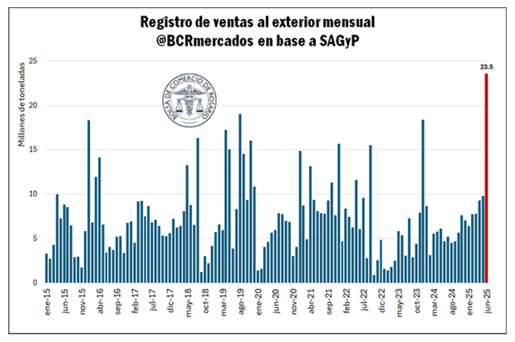 El mes de junio de 2025 fue particularmente significativo, concentrando un 36% del total de las Declaraciones Juradas de Venta al Exterior (DJVE) del semestre, con 23.53 millones de toneladas. Este volumen convierte a junio de 2025 en el mes con el mayor registro de ventas agroindustriales al exterior de la historia.