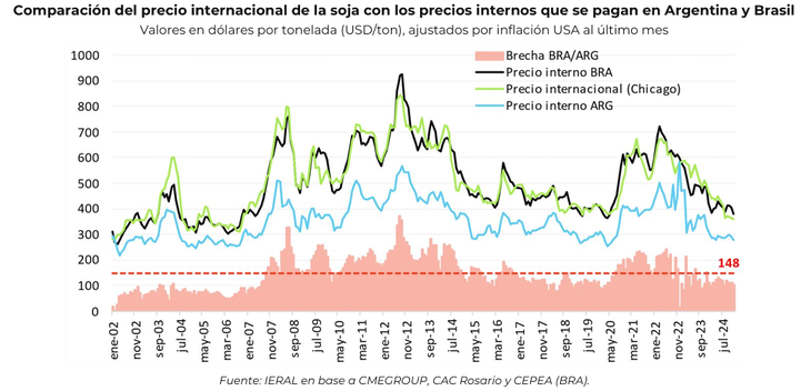 Para tener referencia, entre los años 2002 y 2023 un productor de Brasil recibió en promedio unos USD 148 más por cada tonelada de soja que uno de Argentina (+40%) y en el 2024 esa brecha fue también del 35-40% en favor del país vecino.