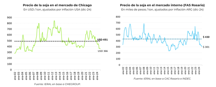 En el mercado internacional (Chicago) la soja promedió USD 361 la tonelada en diciembre 2024. Este precio se ubica 27% por debajo de la cotización promedio del período 2002 – 2023 (USD 491/ton, en USD de poder de compra constante) y debe retrocederse hasta fines del año 2006 para encontrar valores más bajos.