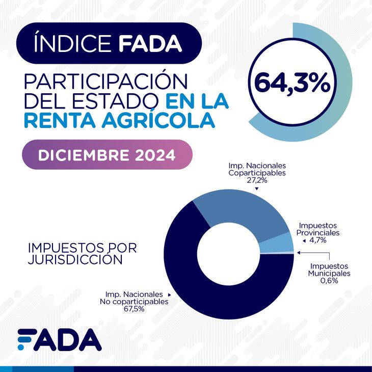 Un estudio presentado ayer por la Fundación Agropecuaria para el Desarrollo de Argentina (FADA) reveló que el Estado se queda con $64,30 de cada $100 de renta agrícola. El índice subió 2,8 puntos desde la medición de septiembre, principalmente por la caída de precios y el menor efecto del dólar exportador. Comparado con diciembre 2023 es 5,4 puntos más alto. Si se desglosa lo que se paga por jurisdicción, 94,7% son impuestos nacionales, 4,7% provinciales y el resto municipales. Un casó que no se repite en ningún país del globo.