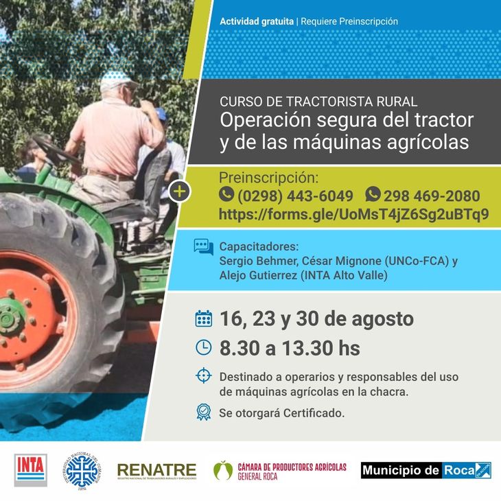 INTA General Roca, junto a otras instituciones, informa que se encuentra abierta la preinscripción al curso gratuito de tractorista rural, destinado exclusivamente a operarios y/o encargados del manejo del tractor y de los equipos y accesorios que son necesarios en cada proceso de producción en la agricultura.