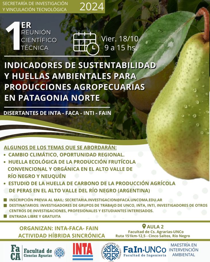El próximo viernes 18 de octubre, de 9 a 15 h, se llevará a cabo la primera reunión científico-técnica sobre «Indicadores de sustentabilidad y huellas ambientales para producciones agropecuarias en Patagonia Norte».