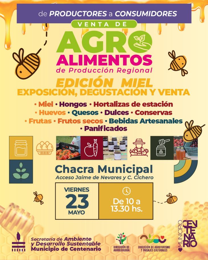 Será una "Edición Miel". Bajo el lema “Sin abejas no hay polinización y sin polinización no hay vida” y en el marco del Día Mundial de las Abejas, la Municipalidad de Centenario invita a participar de la feria de los viernes, que se llevará a cabo el 23 de mayo de 2025, en la Chacra Municipal de Centenario.