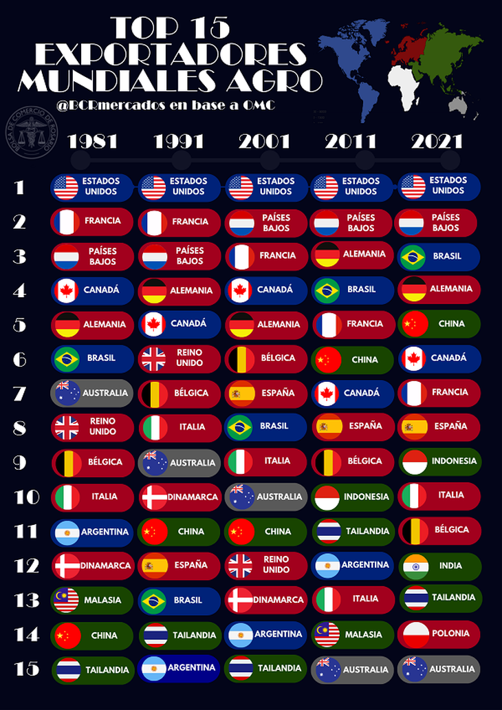 De acuerdo con los datos de la Organización Mundial de Comercio (OMC), Argentina ocupó en 2021 el décimo octavo puesto en el ranking mundial de exportadores agro. Dentro del continente americano ocupó el cuarto lugar, luego de Estados Unidos, Brasil y México.