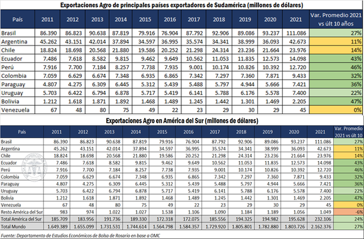 Al estudiar la evolución de exportación de productos agro en los principales países exportadores de América del Sur es notorio que, si bien Argentina se encontró en el segundo puesto de exportaciones del año 2021, es también el segundo país que menos creció en relación con el promedio de los últimos 10 años, sólo por detrás de Venezuela.