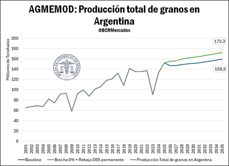 Las proyecciones del modelo son contundentes: la producción agrícola argentina se incrementaría un 8% para el año 2035, pasando de 159,3 a 172,3 millones de toneladas. Este salto productivo se traduce en un valor acumulado adicional de USD 28.800 millones en los próximos diez años (desde la campaña 2025/26 hasta la 2034/35).