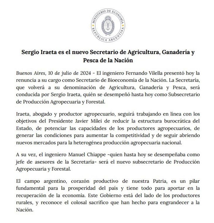 Según informó el ministerio de Economía, Iraeta seguirá "trabajando en línea con los objetivos del presidente Javier Milei de reducir la estructura burocrática del Estado, de potencias las capacidades de los productores agropecuarios, de generar las condiciones para aumentar la competitividad y de seguir abriendo nuevos mercados para la heterogénea producción agropecuaria nacional".