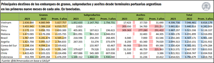 Desagregando la información por países, Vietnam aparece como el principal destino de los envíos totales que se hicieron entre enero y septiembre del año en curso, alcanzando un volumen de 4,5 Mt de embarques de granos, subproductos y aceites. Este guarismo representa una caída del 36% respecto de los embarques a este país en igual período de 2022, y del 48% respecto al promedio de los últimos tres años. El segundo principal destino de nuestros embarques fue China, hacia donde se enviaron 3,6 Mt de productos agroindustriales en los primeros nueve meses del año; ello es, 33% menos que el año anterior y 41% por detrás del promedio de los últimos tres años. En tercer lugar, se destaca Perú, con un volumen de envíos de 2,9 Mt de enero a septiembre, un descenso del 18% respecto al año previo y del 8% con respecto al promedio de los últimos tres años.