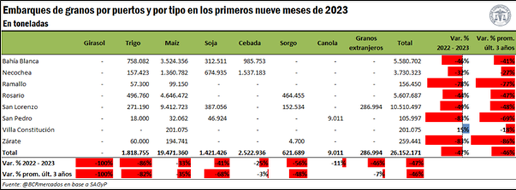 Durante los primeros nueve meses de 2023, Argentina despachó un total de 44,6 Mt de granos, subproductos y aceites, lo que representa un descenso del 41% en los embarques agroindustriales con respecto a igual período del año anterior. Este derrumbe se explica principalmente por una reducción en el embarque de granos: de enero a septiembre, se despacharon 26,2 Mt, una disminución del 47% con respecto a igual período de 2022. Mientras tanto, los envíos de subproductos y aceites vegetales desde puertos argentinos se redujeron en un 31% y un 19%, respectivamente.