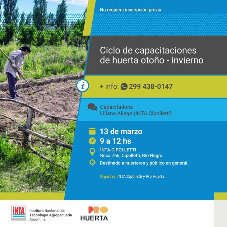 INTA Cipolletti invita a un ciclo de capacitaciones de huerta otoño-invierno 2024, los días 13, 20 y 27 de marzo, de 9 a 12 h, en la Agencia de Extensión Rural de esa localidad (Roca 766). La técnica Liliana Aliaga será la encargada de brindar información y asesoramiento al público presente.