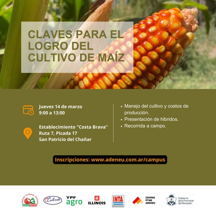 Los contenidos y las demostraciones estarán a cargo de profesionales del Centro PyME-ADENEU y del INTA Valle Medio. Por otro lado, un representante técnico de Servicios Cipolletti (YPF Agro), presentará los híbridos utilizados en el ensayo. La actividad requiere inscripción previa, sin costo en www.adeneu.com.ar/campus.
