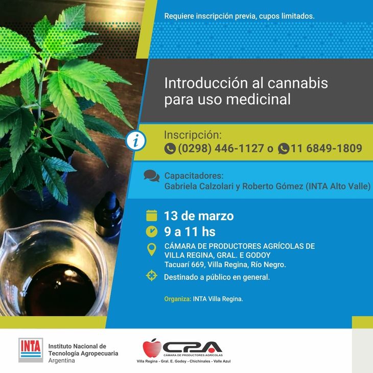 La charla “Introducción al cannabis para uso medicinal” se llevará a cabo el miércoles 13 de marzo, de 9 a 11 h, en la Cámara de Productores Agrícolas de Villa Regina – General E. Godoy (Tacuarí 669). Está destinada al público general, con entrada libre y gratuita.