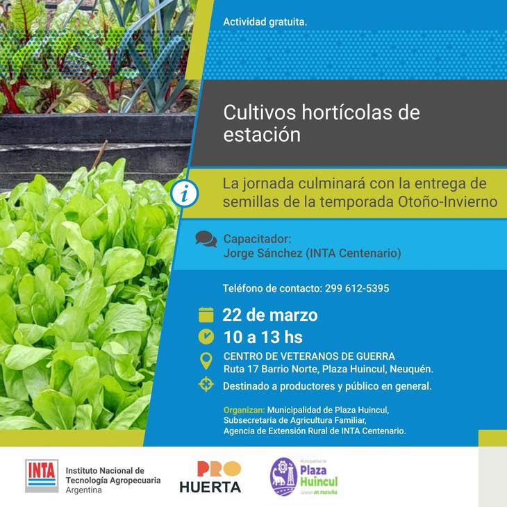 Durante la mañana del viernes 22, de 10 a 13, se brindará una capacitación sobre “Cultivos hortícolas de estación”, a cargo del ingeniero agrónomo Jorge Sánchez, de la Agencia de Extensión Rural de INTA Centenario, en Plaza Huincul.