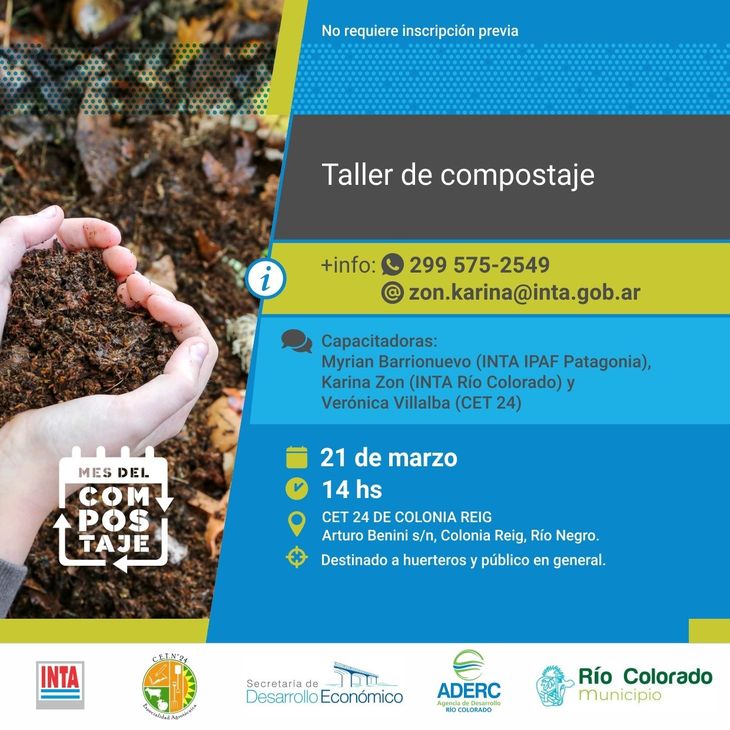 Hoy, 21 de marzo, se llevará a cabo el Taller de Compostaje, en las instalaciones de la escuela agrotécnica CET 24, de Colonia Reig (Río Colorado). El mismo estará a cargo de las capacitadoras Myrian Barrionuevo (INTA IPAF Patagonia), Karina Zon (INTA Río Colorado) y Verónica Villalba (CET 24).