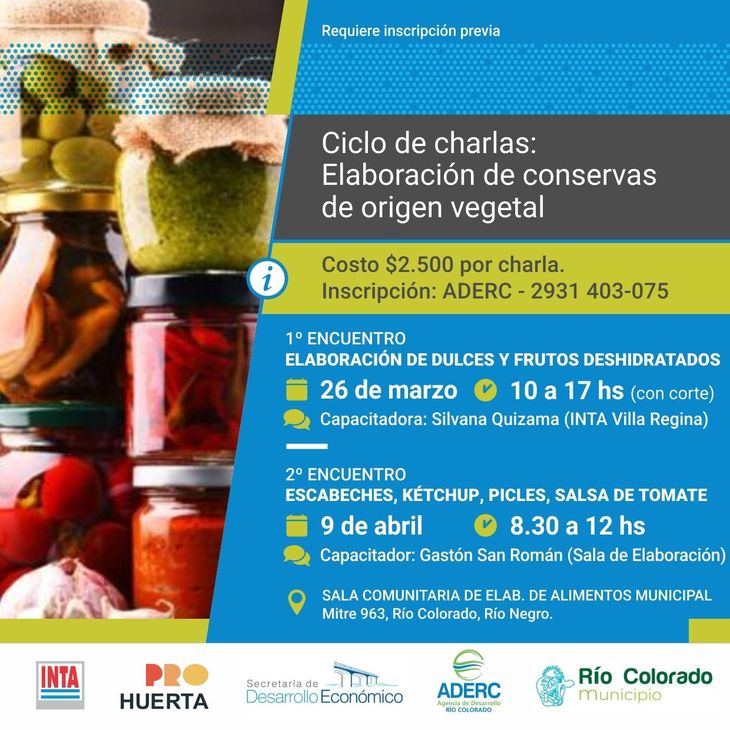 Una semana más tarde, el 26 de marzo, el INTA ofrece el ciclo de charlas “Elaboración de conservas de origen vegetal” en Río Colorado. El primer encuentro será sobre "Elaboración de dulces y frutos deshidratados", y el segundo, de "Escabeches, kétchup, pickles, salsa de tomate". En este caso, el costo es de $2500 por charla.