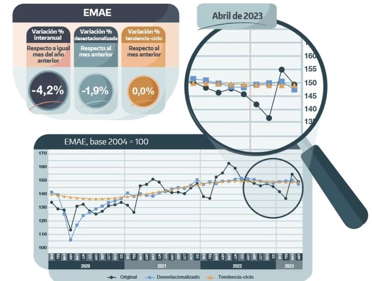 En abril, el Estimador mensual de actividad económica (EMAE) registró una caída de 4,2% en la comparación interanual, y de 1,9% respecto de marzo en la medición desestacionalizada.
