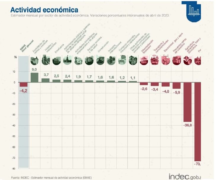 El INDEC informó en estos días que la actividad económica cayó 4,2% interanual en abril último, como consecuencia del impacto de la sequía en la actividad agropecuaria. Los cinco sectores de actividad registraron caídas en la comparación interanual son: Pesca (-73,1%) y Agricultura, ganadería, caza y silvicultura (-36,8%), siendo este último, además, el de mayor incidencia negativa.