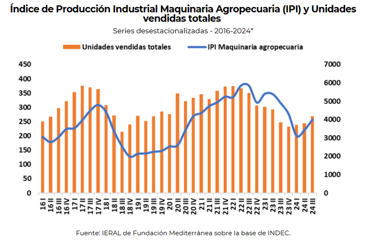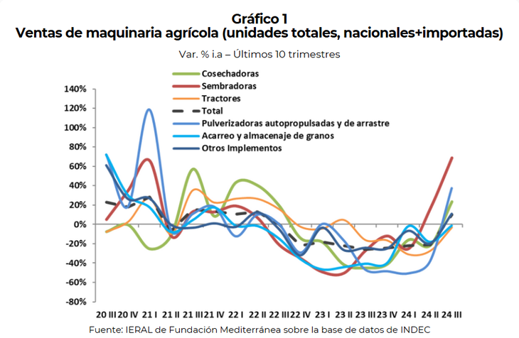 Por estos días se conoció un informe del Instituto de Estudios sobre la Realidad Argentina y Latinoamericana (IERAL), de Fundación Mediterránea, que hace foco en la maquinaria agrícola. Según el reporte, todos los segmentos tuvieron un repunte de ventas en el tercer trimestre del año, se destacan: cosechadoras (+17% entre trimestres, sin contar estacionalidad), tractores (+12%), implementos (+8%) y sembradoras (+5%).