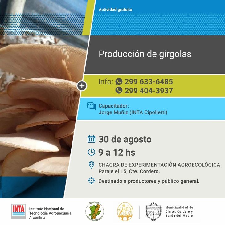 La capacitación sobre "Producción de gírgolas" se llevará a cabo el viernes 30 de agosto, de 9 a 12, en la Chacra de Experimentación Agroecológica (CEA), ubicada en Paraje El 15, Contralmirante Cordero (Google Maps: https://goo.gl/maps/Pf7VXmQjRA2nFbDd8).