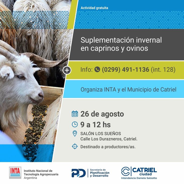 INTA Cipolletti y la Municipalidad de Catriel invitan a participar de una jornada-taller sobre suplementación invernal para caprinos y ovinos. La actividad es gratuita y no requiere inscripción previa.
