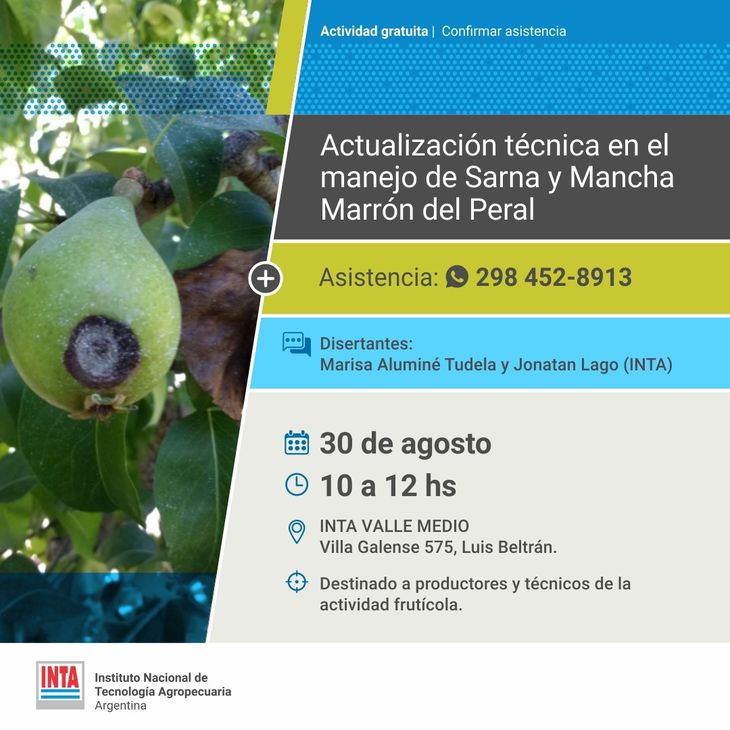 La Agencia de Extensión INTA Valle Medio invita a productores y técnicos de la actividad frutícola a participar de una jornada de actualización técnica sobre el manejo de sarna y mancha marrón del peral.