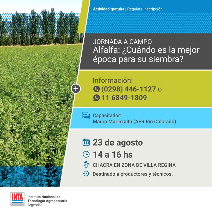 INTA Villa Regina invita a una nueva jornada a campo, denominada "Alfalfa: ¿cuándo es la mejor época para su siembra?", destinada a productores y técnicos agropecuarios. La propuesta se desarrollará de manera gratuita y no requiere experiencia previa.