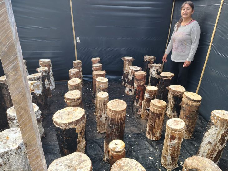 Mirta encontró en los hongos una forma de emprender y salir adelante. “Entre 2007 y 2009 tuve un proyecto en Cutral Co, pero lo dejé por problemas de salud”, relata. El año pasado retomó la idea: “Empecé sembrando algunos troncos y ahora tenemos 300 en producción”. Con el apoyo del Centro PyME-ADENEU, en octubre sembró tres cepas que ya están fructificando. “Hay hongos listos”, cuenta con orgullo.