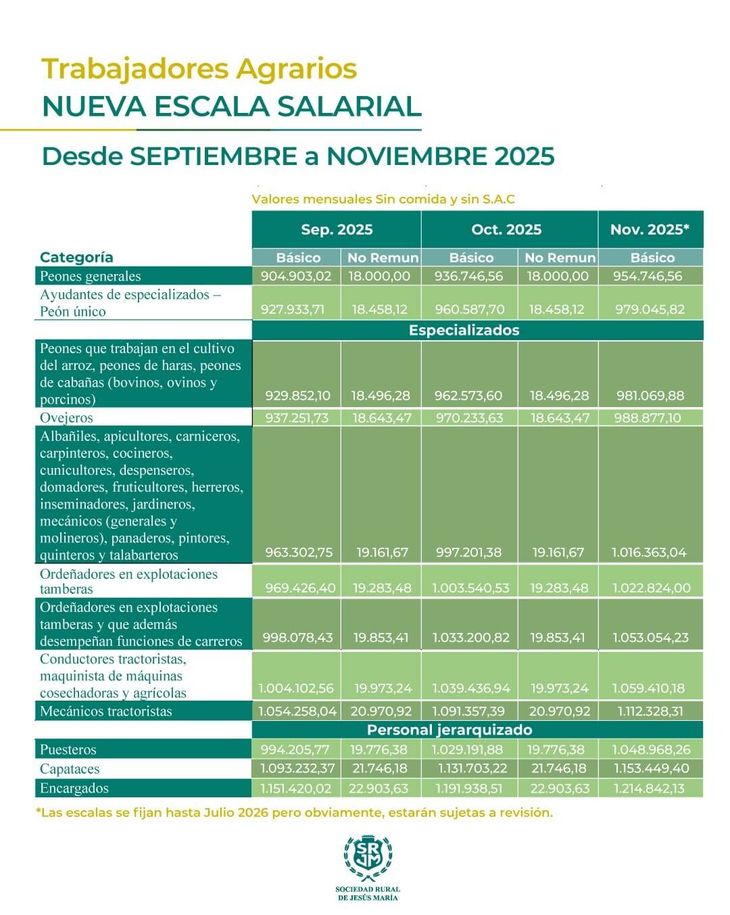 Según lo informado por la Sociedad Rural de Jesús María (SRJM), los haberes de septiembre llegarán con un aumento del 3,5%, al que se sumará en octubre un nuevo 3,5% acumulativo sobre el salario de septiembre. A partir de noviembre, los montos considerados “no remunerativos” pasarán a integrar el básico, lo que representa un reclamo histórico de los trabajadores y un alivio para miles de familias rurales que hasta ahora veían limitado su acceso a beneficios sociales y previsionales.