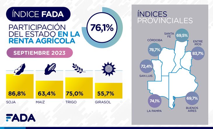 La medición de septiembre de 2023 marca una participación de los impuestos sobre la renta agrícola del 76,1% para el promedio ponderado de los cultivos de soja, maíz, trigo y girasol.