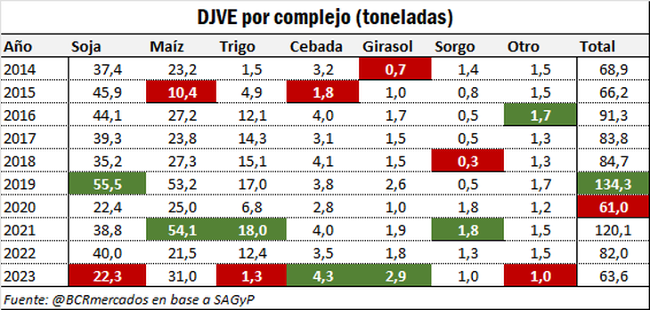 Al analizar más detenidamente cada complejo, se encuentra que los de trigo y soja registraron el menor volumen de ventas externas en la última década. En contraposición, los de cebada y girasol presentaron la mayor cantidad de DJVE de los últimos 10 años, tal como se resume en la tabla adjunta.