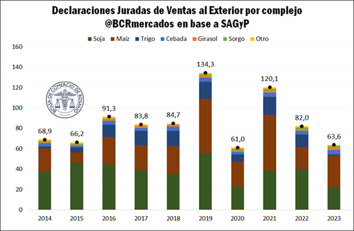 El 2023 cerró como el segundo año con menos ventas al exterior del agro en 10 años. Se anotaron 63,6 Mt de productos que presentan declaraciones juradas de ventas al exterior (DJVE). El 48 % de las toneladas registradas corresponde al complejo maíz, 35 % al complejo soja, 5 % al girasol, mientras que el restante 12 % se distribuye entre trigo, sorgo, cebada, arroz, maní, legumbres, lino, entre otros.