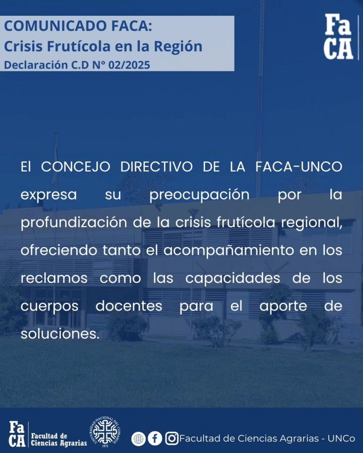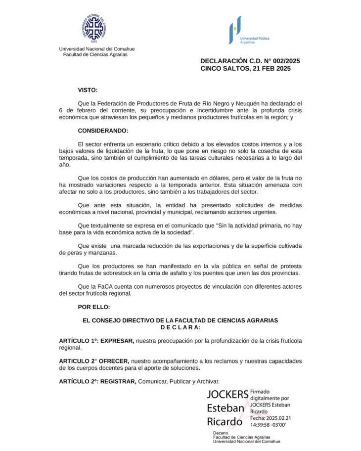 Por este motivo y luego de los fundamentos, la declaración C.D. N° 002/2025 con fecha 21 de febrero de 2025 y firmada por el Decano, Esteban Jockers, manifiesta la “preocupación por la profundización de la crisis frutícola regional”.