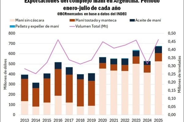 La composición de las exportaciones ha cambiado drásticamente en la última década, con el maní sin cáscara acaparando cerca del 80% de los envíos, desplazando a productos de menor procesamiento como el maní tostado y la manteca, que antes tenían una mayor participación.