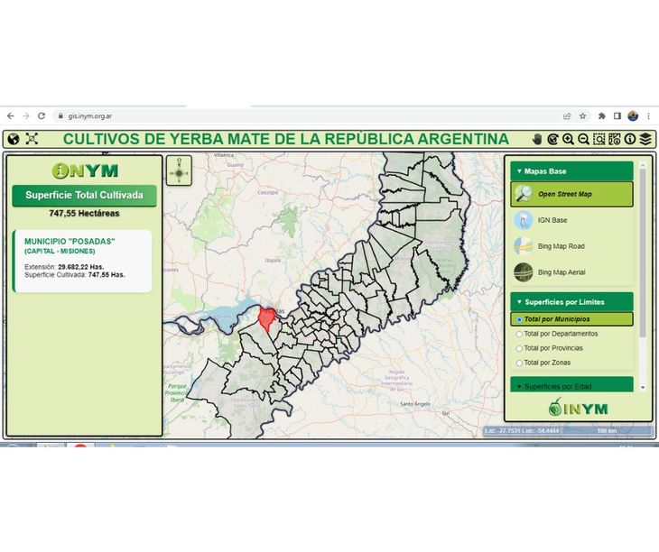 Disponible en el sitio web del INYM (https://gis.inym.org.ar/), el mapa permite visualizar, por zona, provincia (Misiones y Corrientes), departamento y municipio, datos actualizados sobre la superficie, edad y densidad de las plantaciones, así como la cobertura arbórea nativa o forestada en los yerbales.
