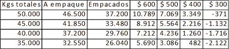 Para lograr un ingreso de 24 millones de pesos anuales a los valores superiores de 40.920 embalados por ha y $ 600/kg se necesitan 1.84 ha y para rendimientos de 28.664 kg embalados a $ 400/kg se necesitan 16 ha.