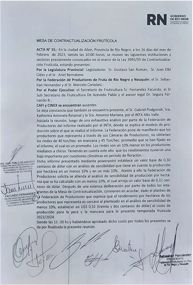 Nota: a continuación, el trabajo completo del INTA al que se hace referencia en este contenido y el acta firmada en la secretaría de Fruticultura de Río Negro.