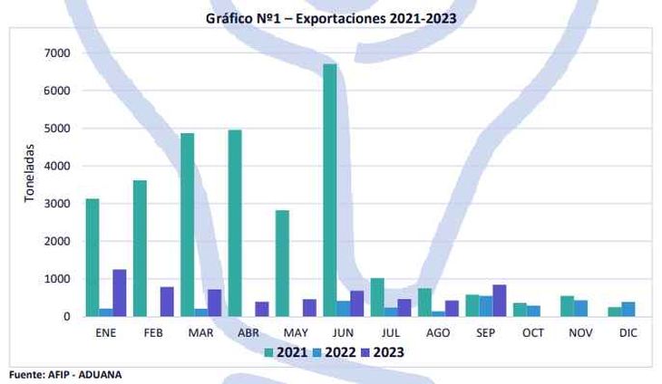 El trabajo destaca que por primera vez desde junio de 2021 las exportaciones en cantidad superan a las importaciones en cantidad, no en valor. Del total exportado el 20.3% (171 toneladas) fueron como carne y el resto subproductos.