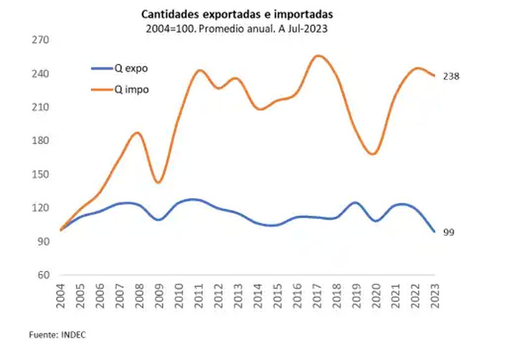 En el período extenso, las cantidades importadas entre 2004 y 2023 aumentaron 138%, mientras que las cantidades exportadas no variaron mayormente como tendencia, aunque entre 2011 y 2023 (julio-23) cayeron un 22%.