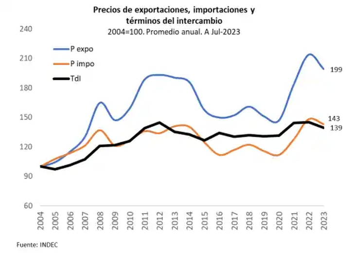 Si bien los precios de las importaciones también aumentaron en los últimos 20 años, esa recomposición fue relativamente menor al aumento de los precios de las exportaciones. Esta situación llevó a una mejora del 39% en los términos del intercambio (comparando 2023 con 2004).