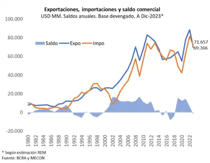 Como es habitual en el ciclo argentino, etapas de expansión económica se asocian con aumentos de importaciones -a veces con déficits comerciales- y viceversa. En términos de secuencia temporal de registro de superávits y déficits: