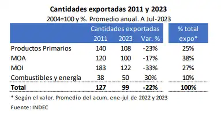 En este último período solo se observan aumentos en las cantidades exportadas en Combustibles y Energía, que representan el 10% de las exportaciones totales1. Aquellas ligadas a productos primarios y sus manufacturas, que representan en conjunto el 63% de las exportaciones, cayeron 20% en el período 2011-2023 y las manufacturas de origen industrial (MOI) el 33%.