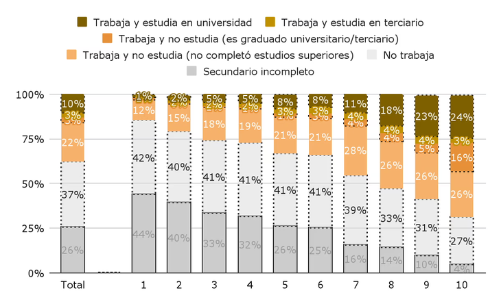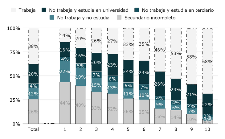 De hecho, las oportunidades educativas y laborales se ven marcadas por los recursos económicos. Entre los jóvenes del decil más alto, son más los que logran concretar sus expectativas: el 51% se dedica a estudiar (el 27% solo estudia y el 24% también trabaja), mientras que el 68% trabaja (41% solo trabaja, y 27% trabaja y estudia en el nivel superior). En cambio, en los sectores más bajos, el porcentaje de quienes siguen estudiando disminuye a 21%: el 19% solo estudia y el 2% también trabaja, mientras que un 12% solo trabaja.