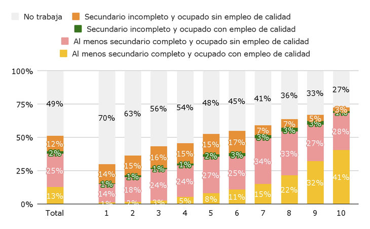 La probabilidad de que los jóvenes accedan a trabajos de calidad es considerablemente mayor entre quienes terminaron el nivel secundario y en los deciles más altos. El 13% de los jóvenes de entre 19 y 25 años tiene un empleo de calidad (entendido como un trabajo de más de 30 horas semanales y con descuento jubilatorio) cuando termina la secundaria. En tanto, los ocupados en empleos de calidad con secundario incompleto son sólo el 2% de los jóvenes de 19 a 25 años. Entre los jóvenes del decil más alto, el 41% de ellos son ocupados con empleos de calidad, mientras que la cifra desciende al 1% en el decil más bajo.