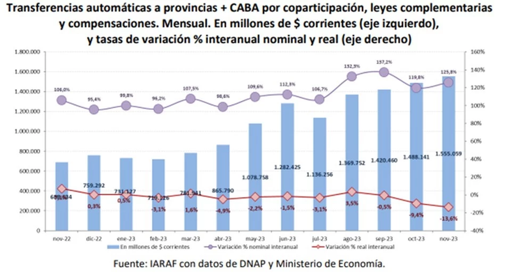 Resulta que en noviembre según los registros oficiales, el gobierno Nacional envió al consolidado de provincias más CABA $1.555.000 millones en concepto de coparticipación, leyes complementarias y compensaciones, frente a $677.000 millones enviados durante igual período del año anterior. Es decir, como explican desde el IARAF, se observó una variación nominal del 125,8%, que, descontando el proceso inflacionario del período, esto se traduciría en una caída real de 13,6%1 interanual.