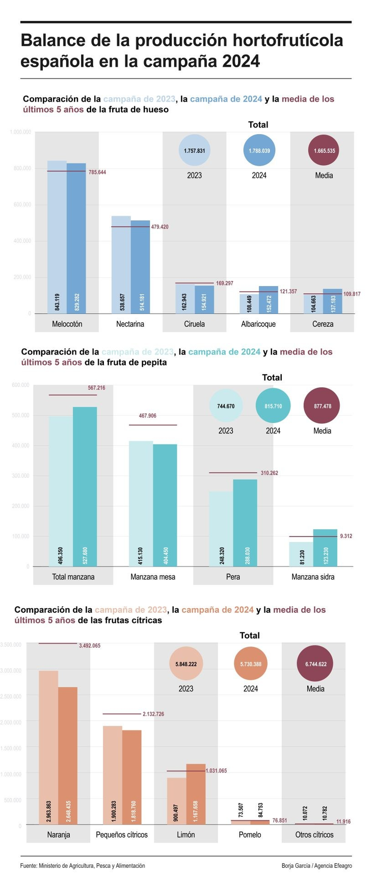 La fruta de pepita ha mejorado sus cifras, con un volumen de 815.710 toneladas, lo que supone un incremento del 9,5% respecto a la campaña 2022-2023, pero un descenso del 7 % si se tiene en cuenta la media sobre las últimas cinco.