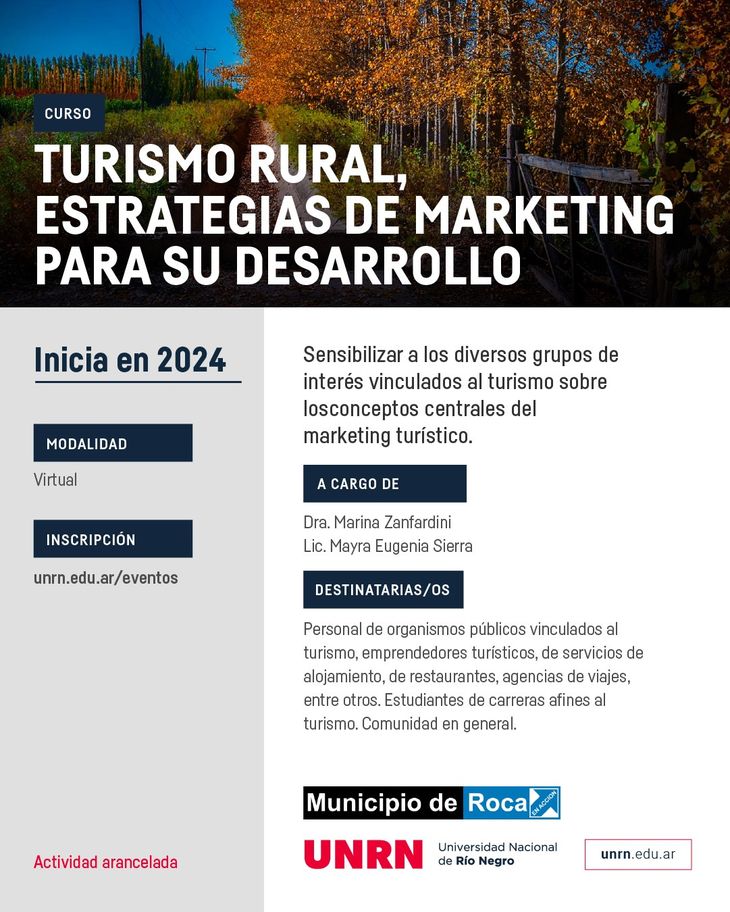 El Departamento de Educación Continua de la Subsecretaría de Extensión de la Universidad Nacional de Río Negro (UNRN) Sede Alto Valle - Valle Medio abrió las inscripciones para el curso de “Turismo Rural: Estrategias de marketing para su desarrollo”. La actividad cuenta con el acompañamiento de la Secretaría de Producción y Desarrollo Sostenible del Municipio de Roca y estará a cargo de la Dra. Marina Zanfardini y la Lic. Mayra Eugenia Sierra.