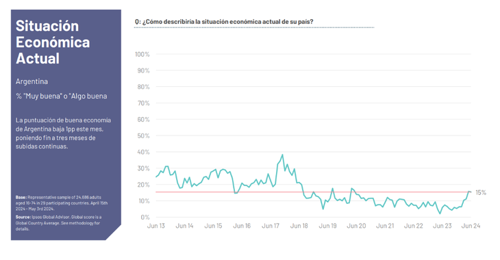 “En la misma encuesta, cuando vos le preguntas a la gente cuál es su situación económica actual, el 15% solamente cree que tiene una buena situación económica en este momento. El 85% no. Mientras que en el mundo esos números son mejores porque el 38% se siente que está en una buena situación económica”, sumó.