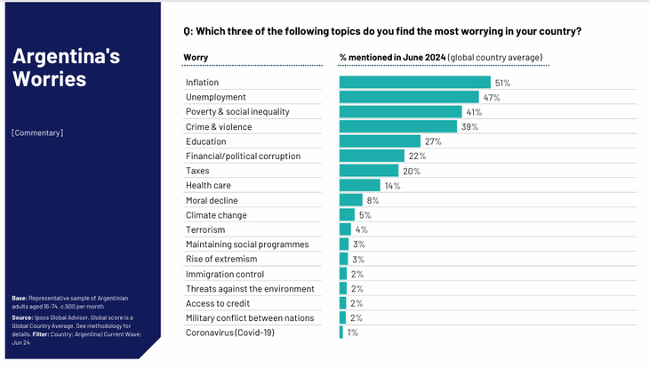 “El mundo tiene otras problemáticas, por ejemplo si miramos Israel cuando hablas de terrorismo es lo que le preocupa al 60% o al 33% los conflictos militares, que acá en Argentina el conflicto militar es un 2% y el terrorismo 4%. Entonces, este tracking nos permite tener una mirada global de ciertas temáticas y después la parte local”, comentó la directora de IPSOS.